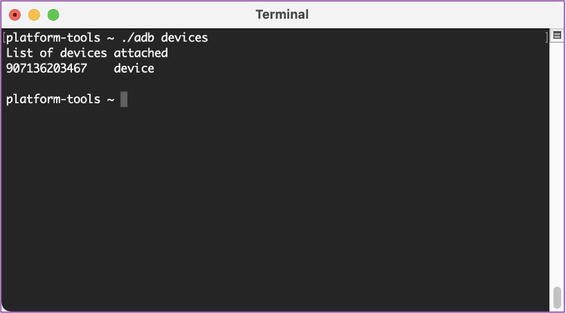 💻 Once we are connected, let’s go back to our computer and confirm. We’ll navigate to the platform-tools folder. We can type “./adb devices” to verify that we do see the Duo and it’s communicating with our workstation.