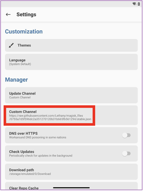 📱 Let’s go to the Magisk settings and copy the address from the text file above and set it as a Custom Channel. You should have a similar screen to what’s below.